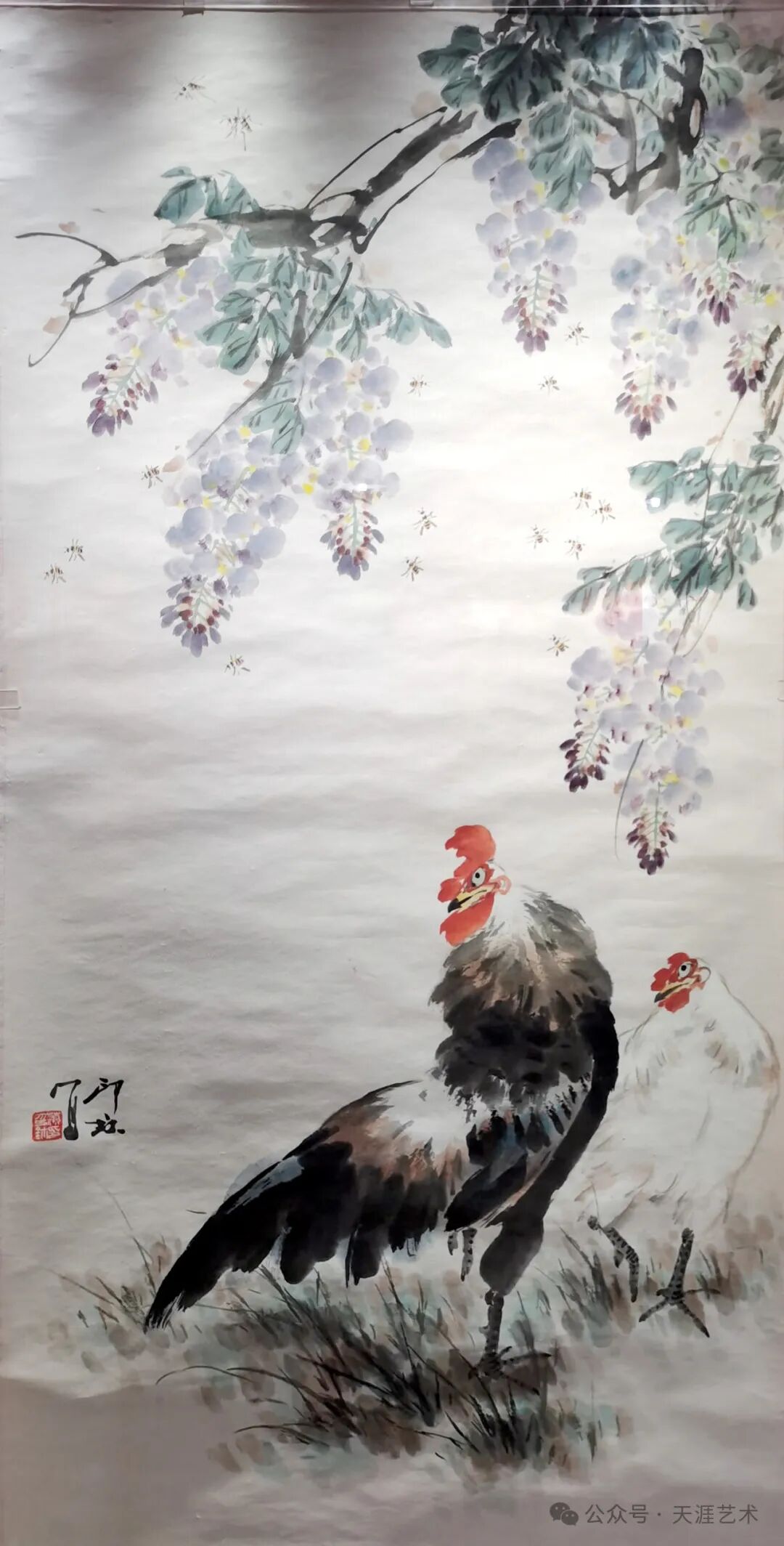 萧朗 紫藤双鸡 136x69 天津美术学院藏