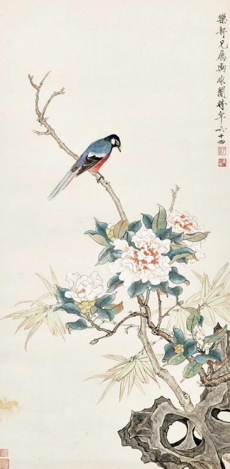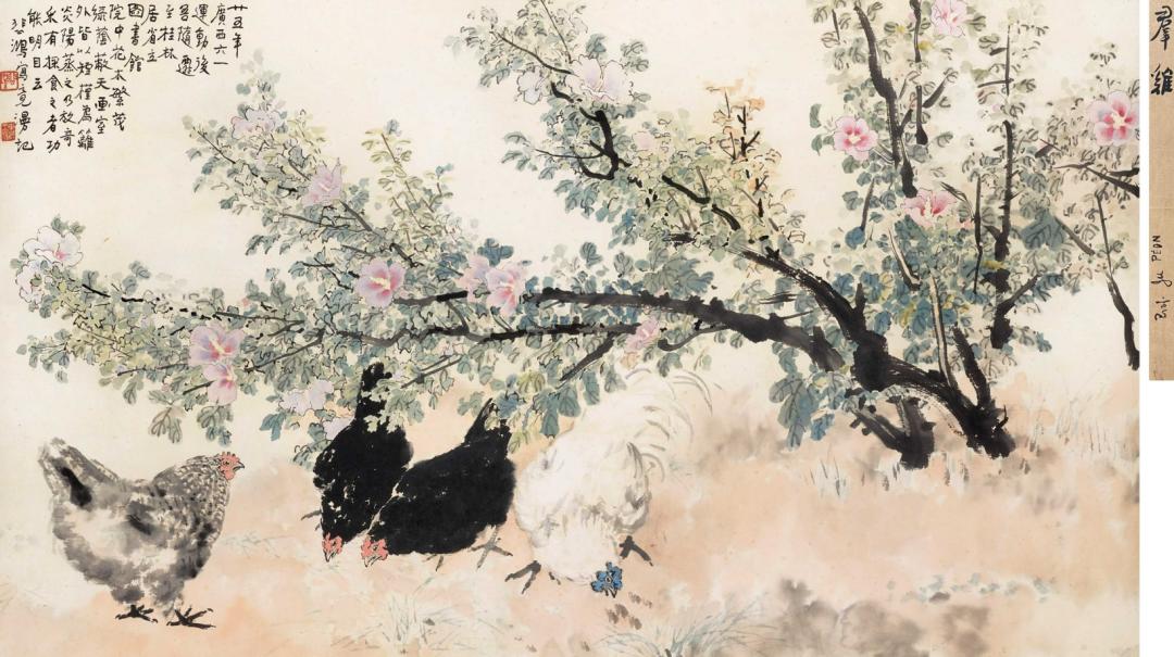 本作透露出徐悲鸿内心的宁静以及对新环境淳朴之美的赞叹。如其题跋所言:“廿五年(1936)广西六一运动后,吾随迁至桂林,居省立图书馆。院中花木繁茂,绿荫蔽天。画室外皆以短槿为篱,炎阳蒸之,乃放奇采,食之者功能明目云。”