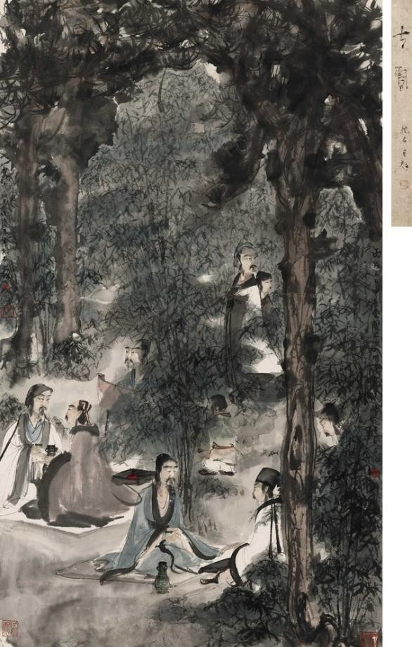 本幅具庞耐(Alice Boney,1901-1988)藏印,为其旧藏。庞耐乃美国著名古玩商,二十年代即从事东方艺术文物经营。四十年代初,收藏方向转向白石及中国画。五十年代初,她分别在美国多个城市的美术馆举行中国书画展。1958年,庞耐移居东京,在当地继续搜求艺术品,直至1974年方迁回美国,其收藏中不乏《洗手图》、《罢阮图》及本幅《竹林七贤》等重要傅抱石作品,可见其对傅氏作品的偏爱与独到眼光。1980年2月此幅转归水松石山房主人,并于2006年释出拍卖市场,由现藏家珍藏至今。