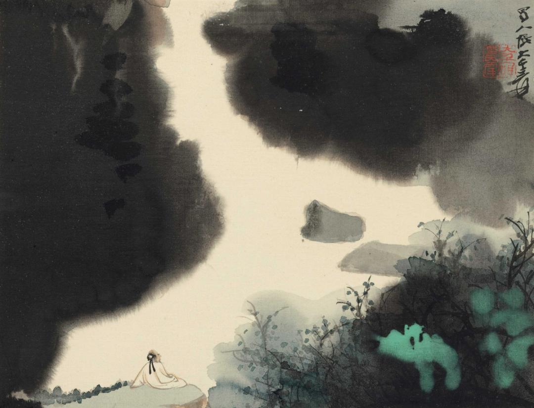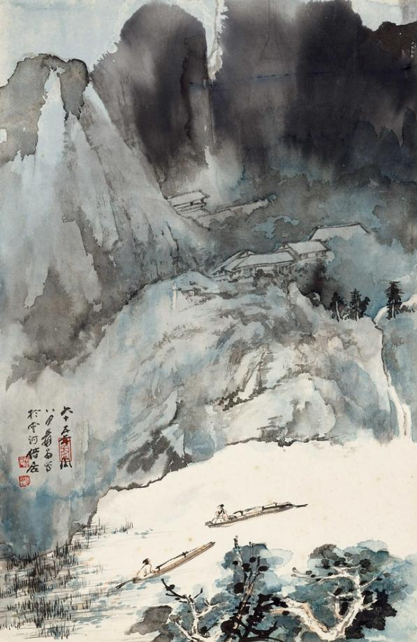 张大千 1976年作 渔舟闲话 镜框