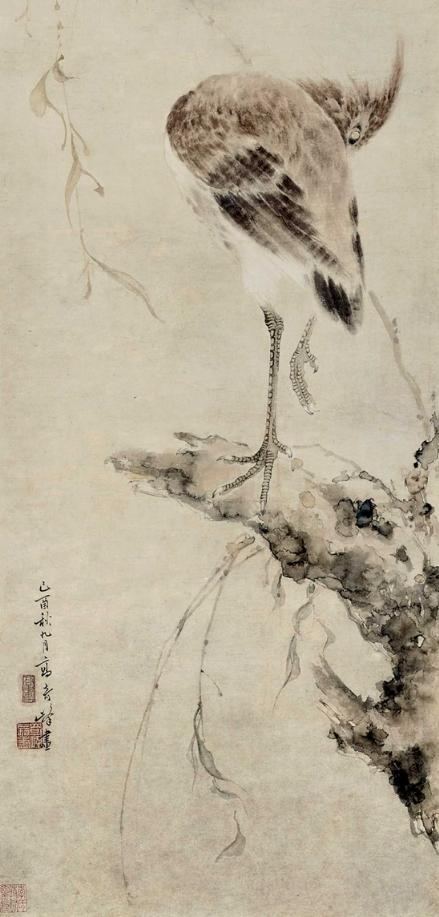 高奇峰 1909年作 柳树苍鹭 镜框