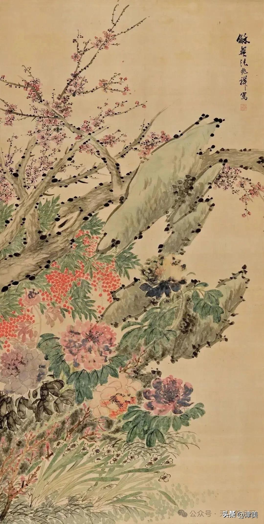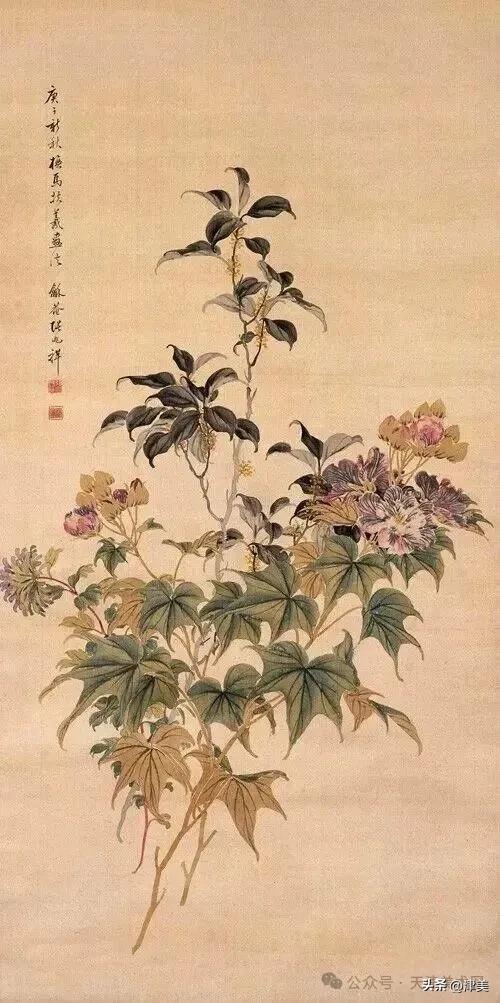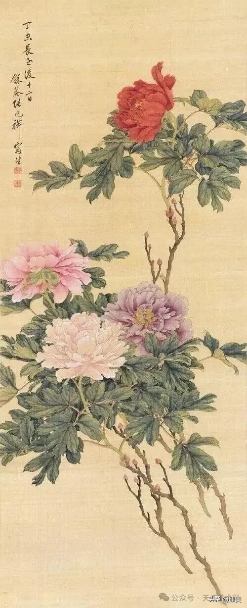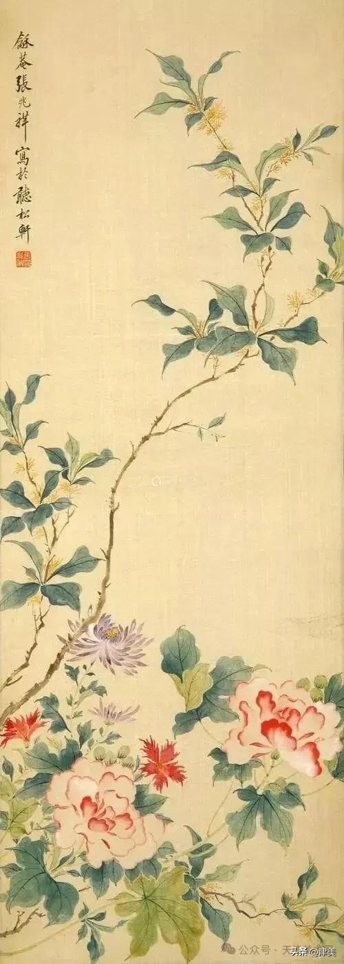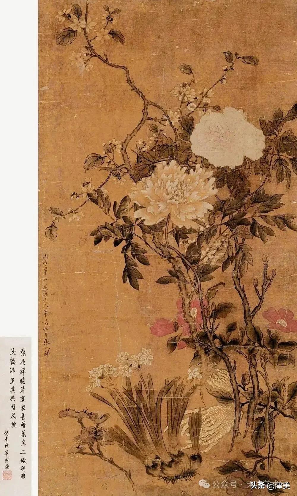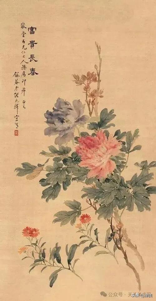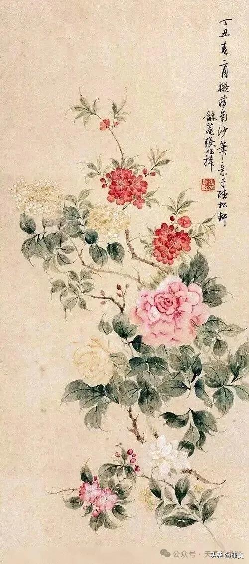 尝于天津文物公司见张兆祥《富贵长寿图》,绢本设色立轴。画的是坡坨奇石上生长的红粉白蓝紫等五色各异的牡丹,花叶皆没骨点厾而成,花枝以潇洒笔触勾勒而成。山石则尽勾皴点染之能事。全画富丽堂皇,工稳精妙,深得物理生机和笔情色趣。题款为“丁未春二月清明前三日龢庵张兆祥”,下钤“张兆祥”,“龢盦”二方印章,可知此作为画家四十五岁时创制。现存天津市艺术博物馆的张兆祥三幅花卉作品,即《泥金地设色折纸花卉册》《天竹牡丹图轴》《秋葵胭脂图轴》,均为罕见珍品。其中《泥金地设色折纸花卉册》共二十四幅册页,画了一百二十种四季花草,大致用了一年半时间。画面金碧辉煌,百花竞艳,异彩纷披,令人叹为观止。其《秋葵胭脂图轴》系光绪三十四年(1908年)所作,大笔巨幅,气势豪放,力犹缚虎,如幽燕老将,横槊赋诗,令人观之心意难平。虽是衰年绝笔,依然活力四溢。