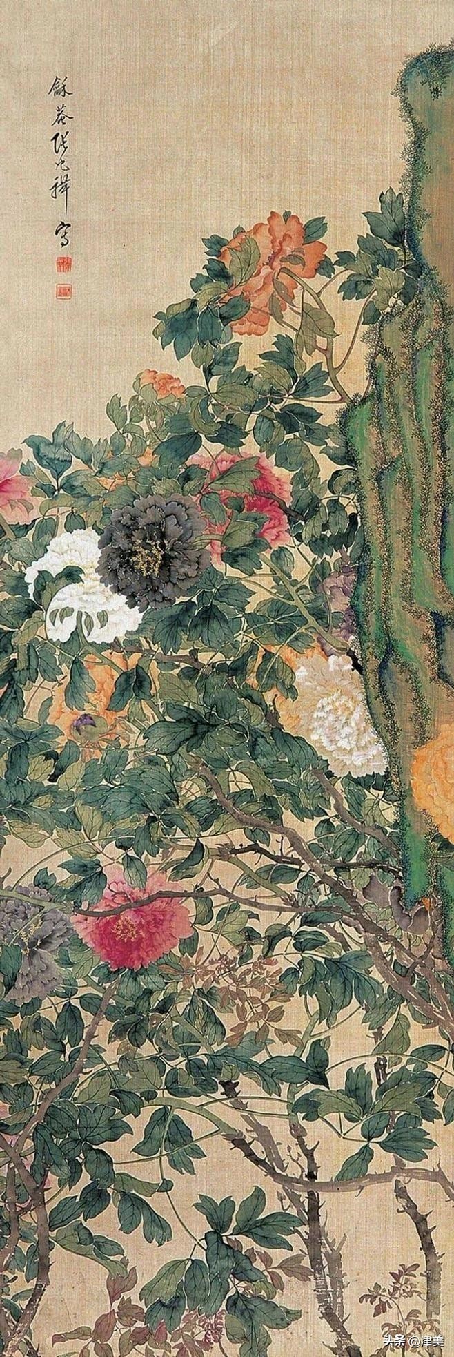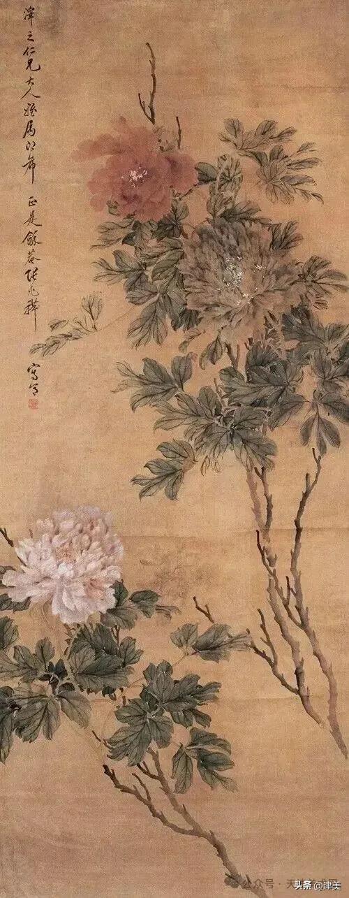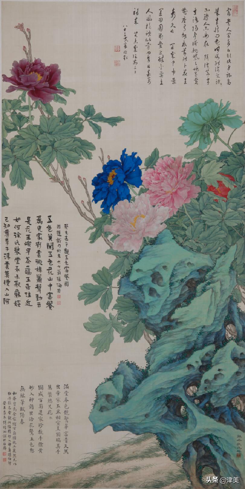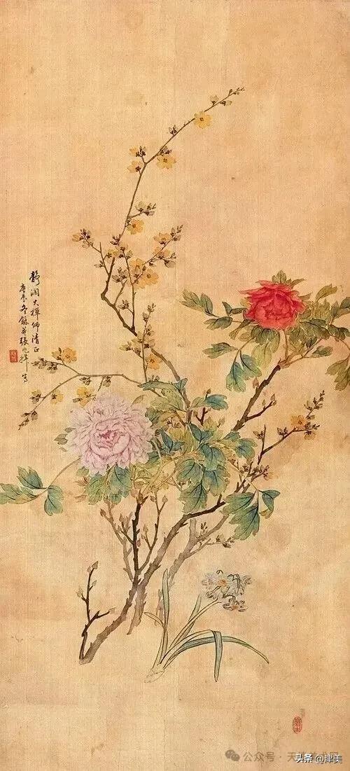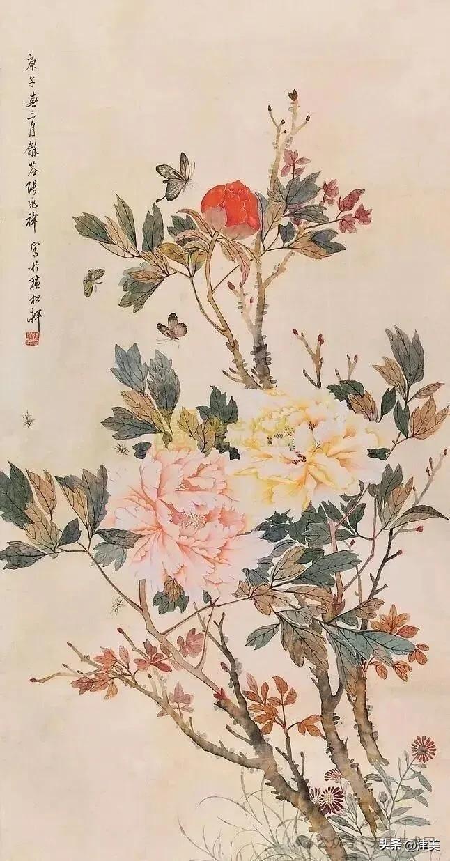 尝于天津文物公司见张兆祥《富贵长寿图》,绢本设色立轴。画的是坡坨奇石上生长的红粉白蓝紫等五色各异的牡丹,花叶皆没骨点厾而成,花枝以潇洒笔触勾勒而成。山石则尽勾皴点染之能事。全画富丽堂皇,工稳精妙,深得物理生机和笔情色趣。题款为“丁未春二月清明前三日龢庵张兆祥”,下钤“张兆祥”,“龢盦”二方印章,可知此作为画家四十五岁时创制。现存天津市艺术博物馆的张兆祥三幅花卉作品,即《泥金地设色折纸花卉册》《天竹牡丹图轴》《秋葵胭脂图轴》,均为罕见珍品。其中《泥金地设色折纸花卉册》共二十四幅册页,画了一百二十种四季花草,大致用了一年半时间。画面金碧辉煌,百花竞艳,异彩纷披,令人叹为观止。其《秋葵胭脂图轴》系光绪三十四年(1908年)所作,大笔巨幅,气势豪放,力犹缚虎,如幽燕老将,横槊赋诗,令人观之心意难平。虽是衰年绝笔,依然活力四溢。