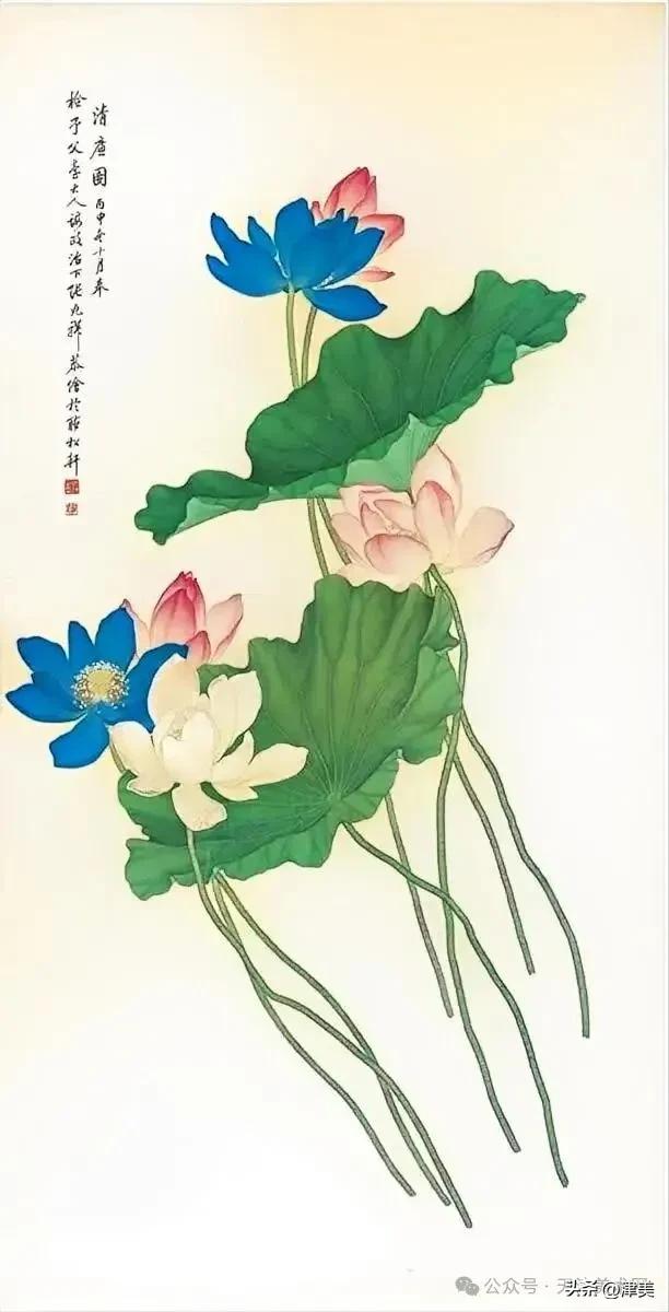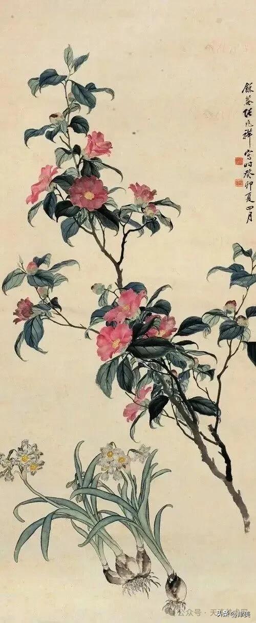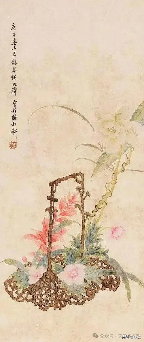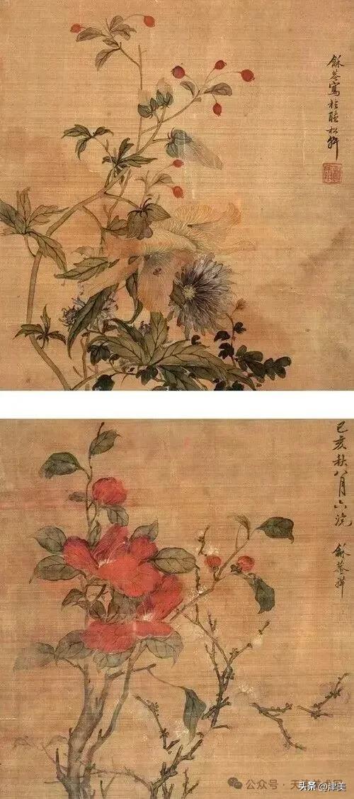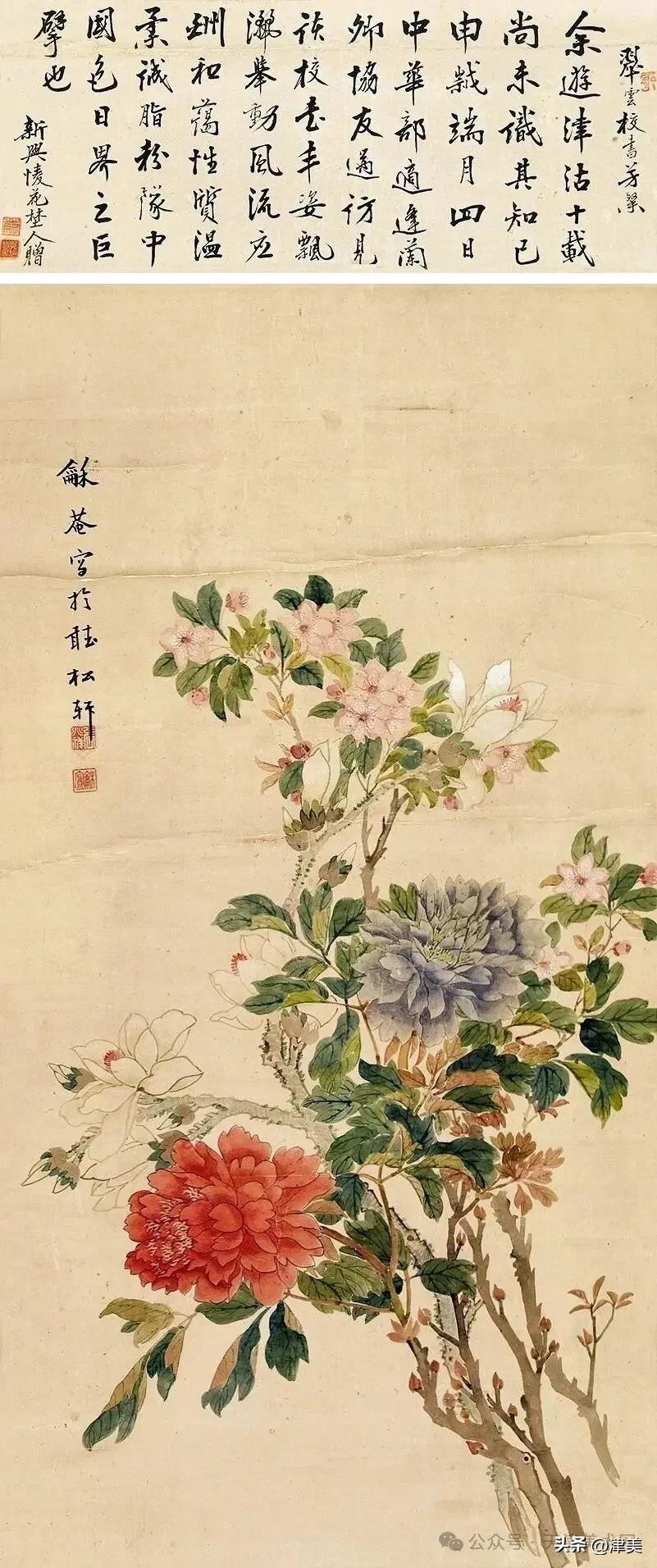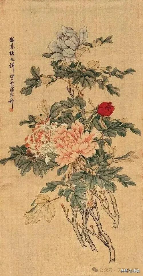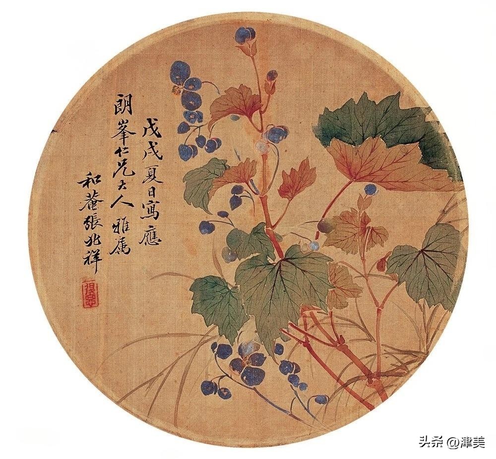 尝于天津文物公司见张兆祥《富贵长寿图》,绢本设色立轴。画的是坡坨奇石上生长的红粉白蓝紫等五色各异的牡丹,花叶皆没骨点厾而成,花枝以潇洒笔触勾勒而成。山石则尽勾皴点染之能事。全画富丽堂皇,工稳精妙,深得物理生机和笔情色趣。题款为“丁未春二月清明前三日龢庵张兆祥”,下钤“张兆祥”,“龢盦”二方印章,可知此作为画家四十五岁时创制。现存天津市艺术博物馆的张兆祥三幅花卉作品,即《泥金地设色折纸花卉册》《天竹牡丹图轴》《秋葵胭脂图轴》,均为罕见珍品。其中《泥金地设色折纸花卉册》共二十四幅册页,画了一百二十种四季花草,大致用了一年半时间。画面金碧辉煌,百花竞艳,异彩纷披,令人叹为观止。其《秋葵胭脂图轴》系光绪三十四年(1908年)所作,大笔巨幅,气势豪放,力犹缚虎,如幽燕老将,横槊赋诗,令人观之心意难平。虽是衰年绝笔,依然活力四溢。